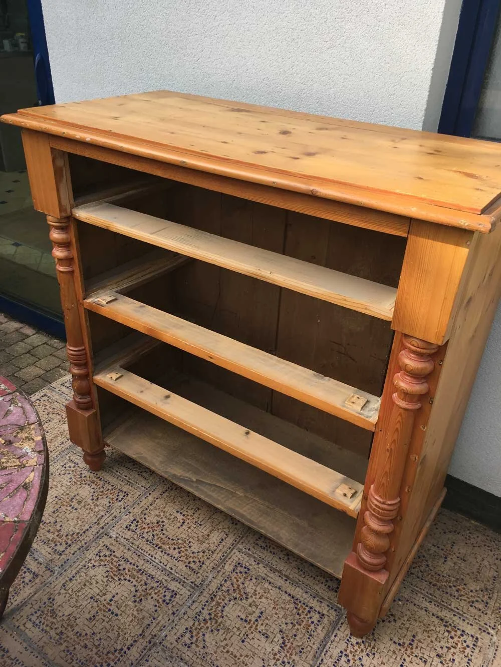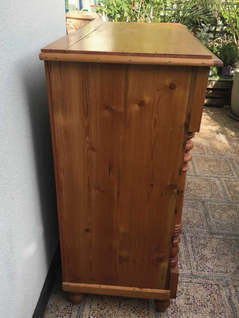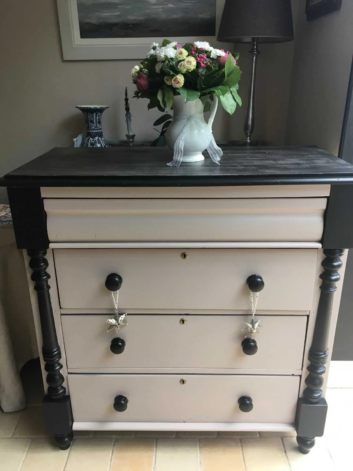 Seconde vie pour cette commode anglaise en pin massif. Une peinture velours rose poudrée a été choisie pour un aspect plus soyeux ; afin de faire ressortir les reliefs et les boutons des tiroirs, j'ai appliqué un vernis noir mat. Le dessus du plateau a été patiné et ciré.