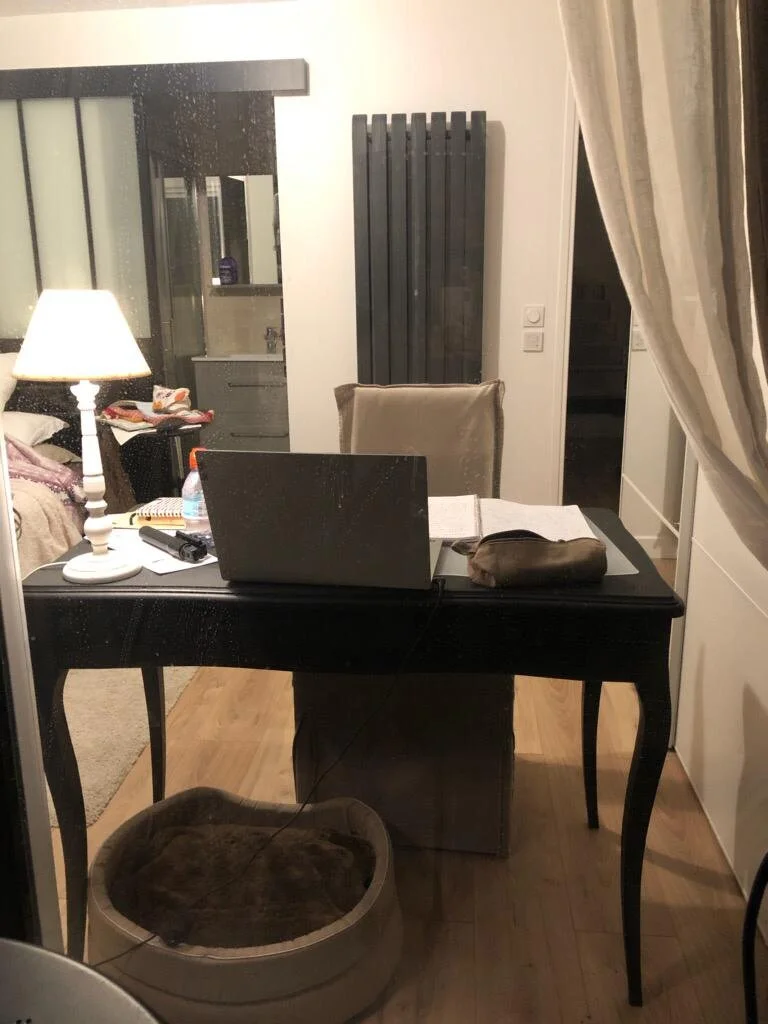 Le noir est tendance et pour s'harmoniser parfaitement avec la cloison industrielle et le radiateur noir de la chambre, le bureau a été repeint en noir avec une finition mat sur le plateau pour une protection optimale.