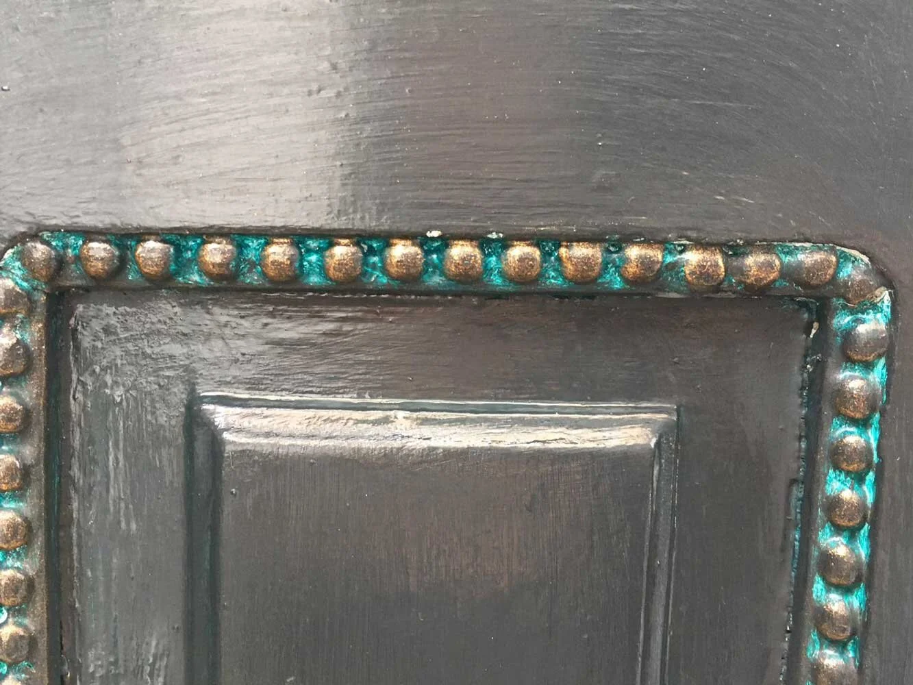 Pour faire ressortir toutes les moulures et lui donner un aspect miroir ancien, j'ai appliqué des pigments couleur bronze