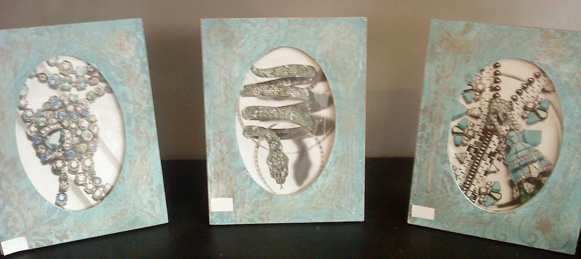 Afin de mettre en valeur les photos de la collection Boucheron où émeraudes et diamants blancs s'entremêlent, il fallait que les cadres s'harmonisent avec les pierres précieuses. Pour cela, j'ai choisi de faire une patine turquoise blanchie avec des touches de bronze très légères.