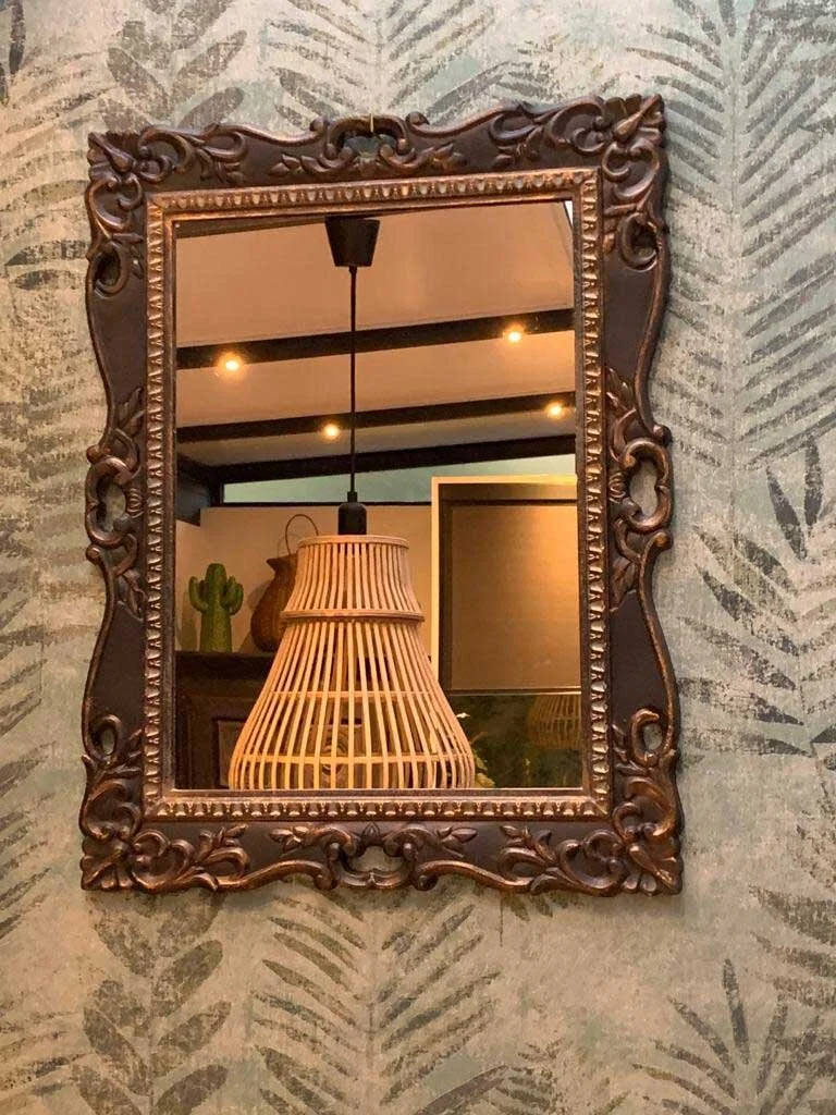 Ce petit miroir peint en blanc à l'origine a été patiné en noir mat pour un aspect chic.